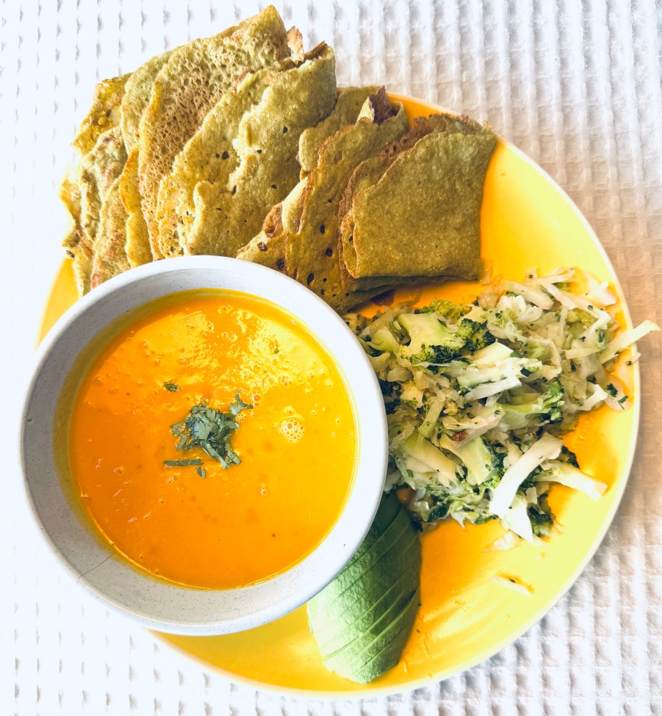 Mung Bean Crepes, Spiced Pumpkin Soup, Thai Cabbage & Broc Slaw, Creamy Avocado 💕