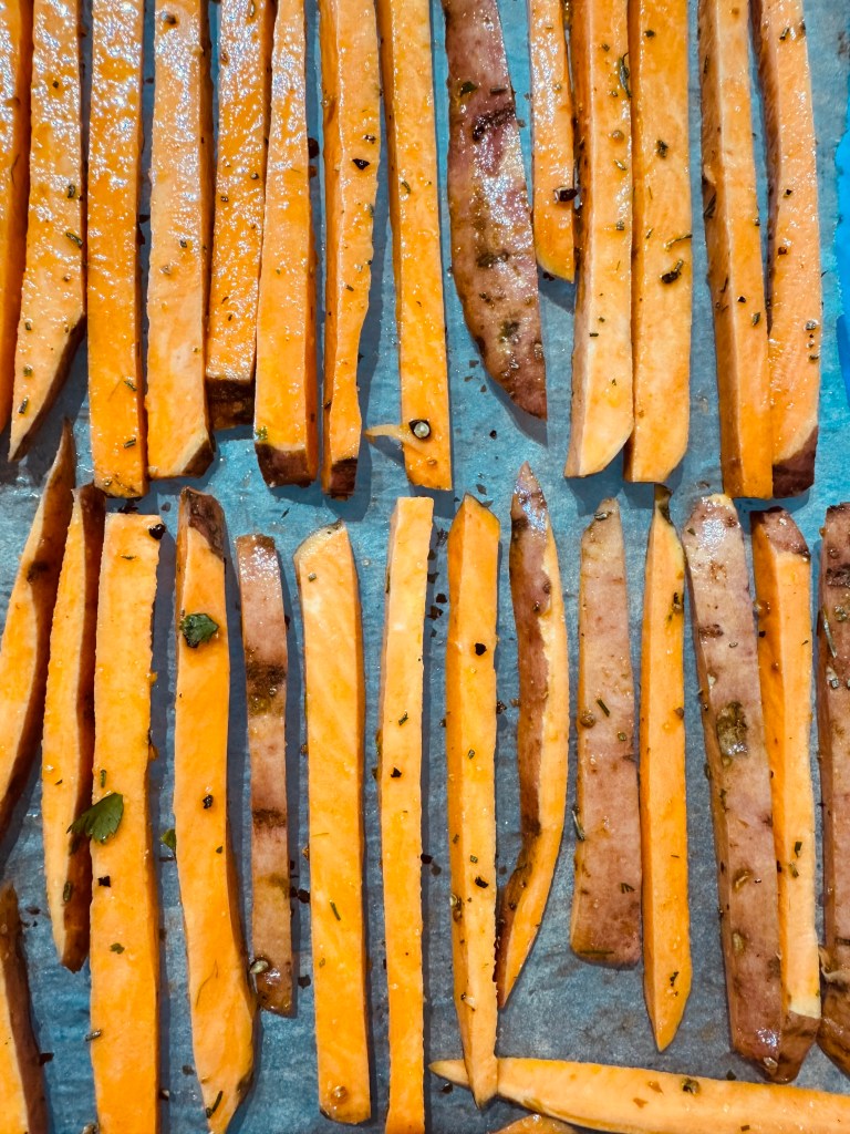 - Slice your sweet potatoes into your most desired fancy shapes – I’ve gone the thin French fry route – other options include wedges, thick cut chips, moons, half moons etc.