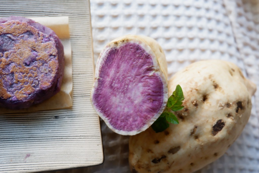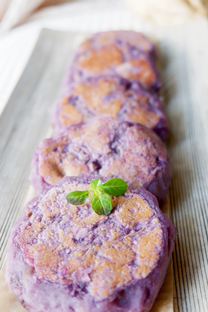 I am a little obsessed with purple sweet potatoes lately. They are evidently in season in Southeast Queensland, Australia at the moment due to them being available in all the shops. They have a somewhat more dense flesh than the common orange fleshed ones, and are more akin to – I believe- a yam. Their colour when cut is a beautiful purple and white tie-dyed appearance, and when cooked, they donβt loos their purple colour – as you can see by the photos the purple is almost enhanced by the cooking process.